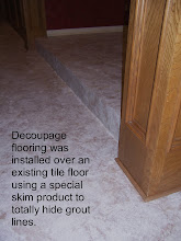 Here's a BEFORE and AFTER on a tiled entry way and adjacent bathroom. The builder of the house must have gotten a great deal on green marble tiles and hoped everyone loved that color. Well, this homeowner didn't. So I skimmed over it with my super-duper product that covers the tile so it doesn't have to be removed, then decoupaged it. The colors incorporated into this custom floor match adjacent wall paints and decor. Homeowner said he was "blown away by how great the floor looks now". Nice to hear, thanks! (Green tape comes off tomorrow after final sealer goes on...)